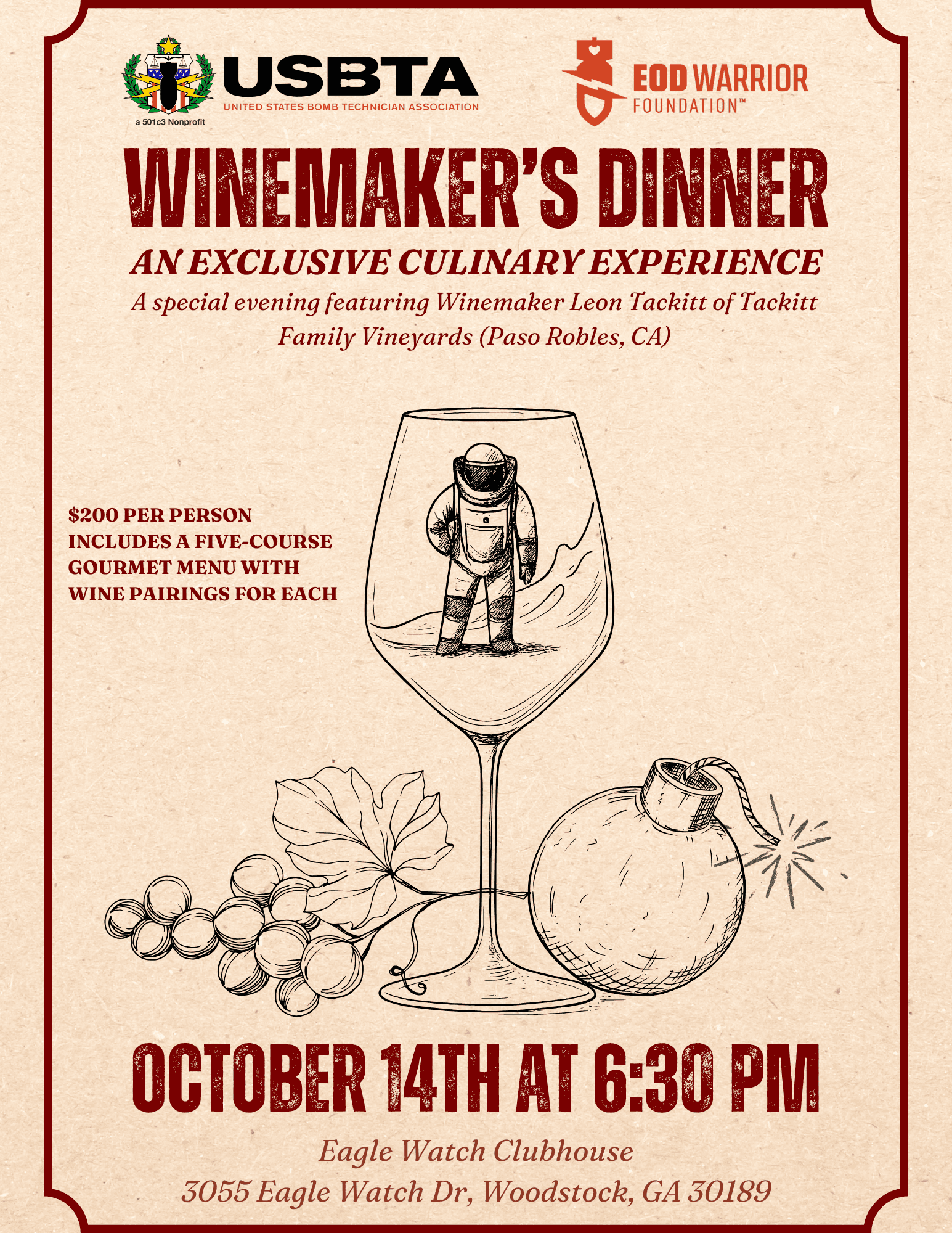 The Winemaker’s Dinner will bring together friends and supporters to benefit the United States Bomb Technician Association and the EOD Warrior Foundation.